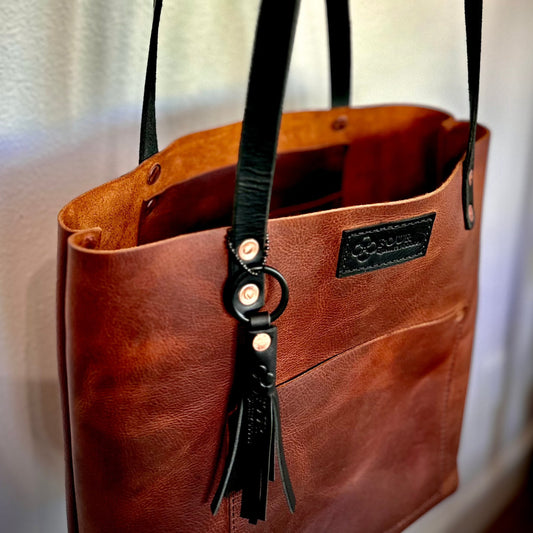Each of our tote bags bring a unique style to cover every occasion. They are each hand crafted, with no machines used. That is right, each tote is hand stitched utilizing Maine Thread Co. waxed thread. This provides unwavering quality and consistency to every bag. We utilize full grain, vegetable tanned, 4.5 oz leather for the body of the bag and 10 oz. full grain, vegetable tanned leather for the straps. The Premium and Classic Mini totes come with dyed and burnished edges. The Daily tote is purposefully more rustic and comes with less finished edges. Each tote is conditioned with Smith's Leather Balm before shipping.