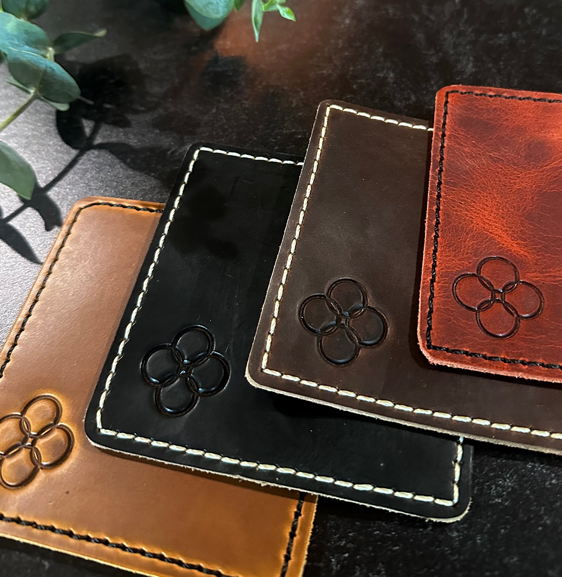 Each set includes 4 hand-stitched coasters made from a variety of full grain leather colors. Each set will vary in color and weight. Each coaster measures 4"x4".